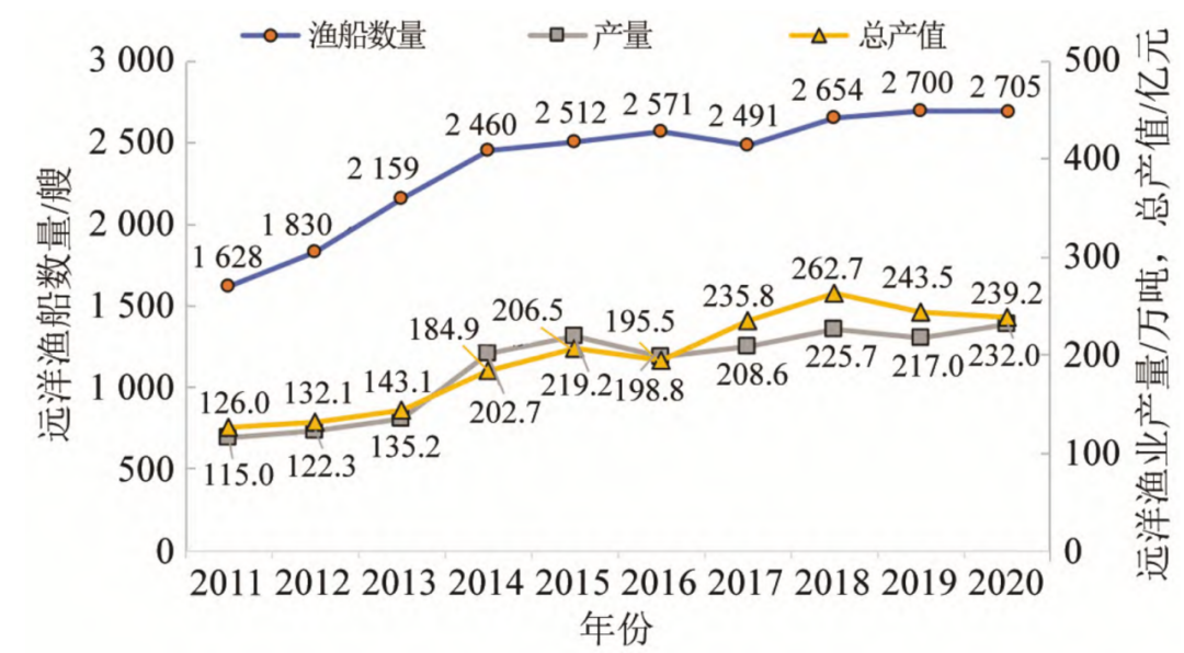 全國遠洋漁船2700余艘,作業海域現擴展到40個國家和地區的專屬經濟區以及太平洋、大西洋、印度洋及南極公海,在境外建立了約130多個基地(代表處)和合資企業,最新統計數據顯示,2020年我國遠洋漁業產量達232萬噸,年產值達239.2億元,已成為世界主要遠洋漁業國家之一。